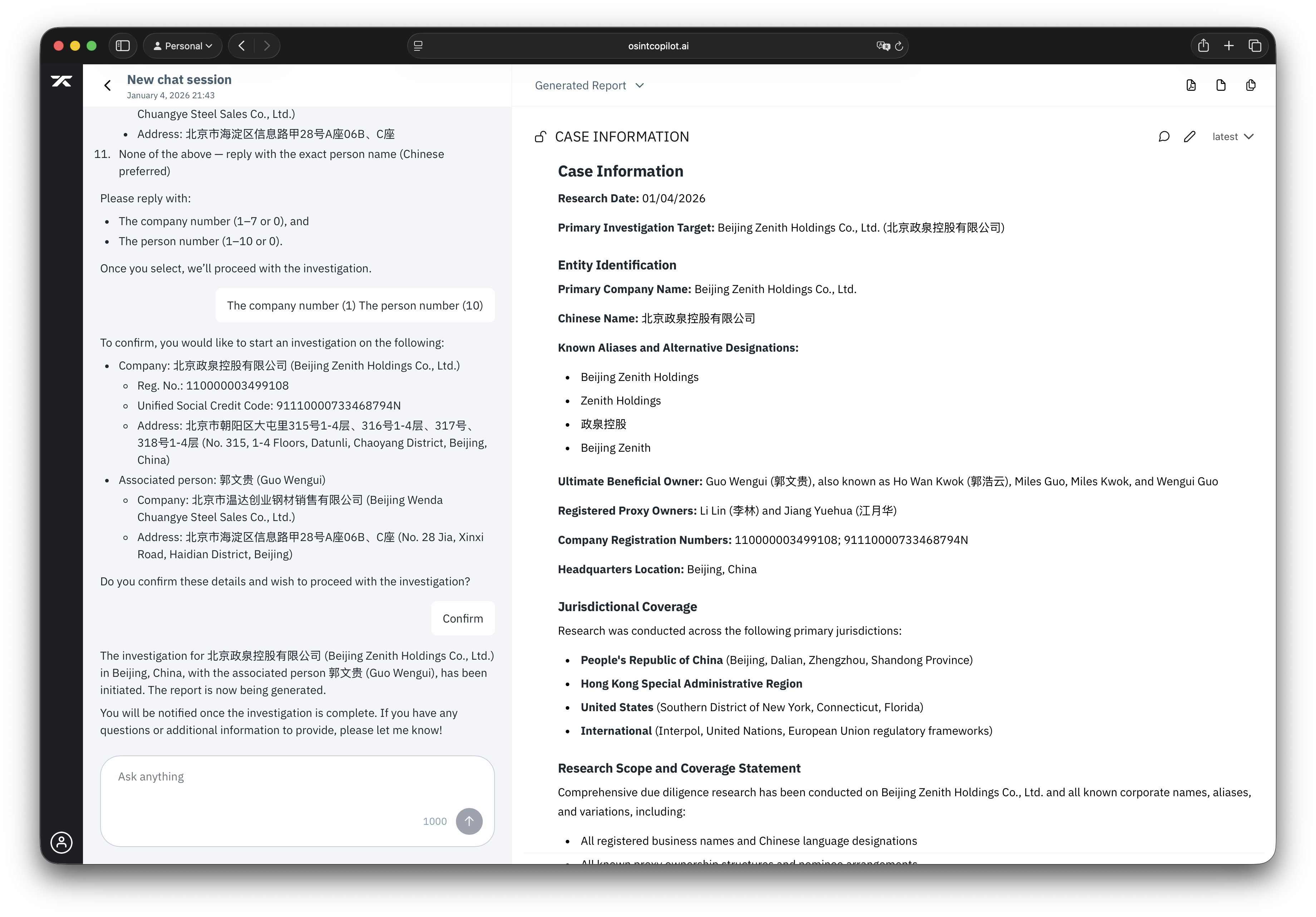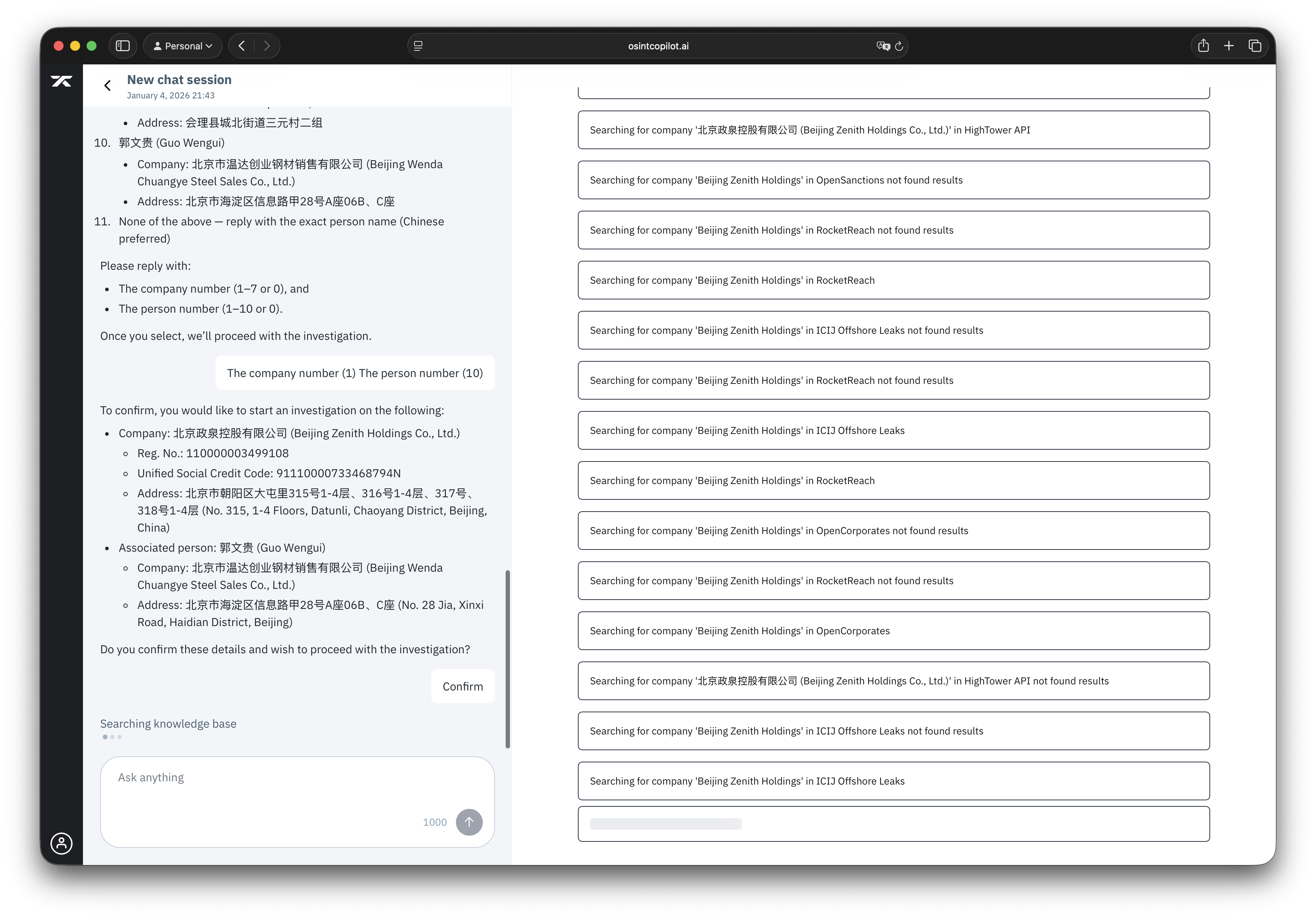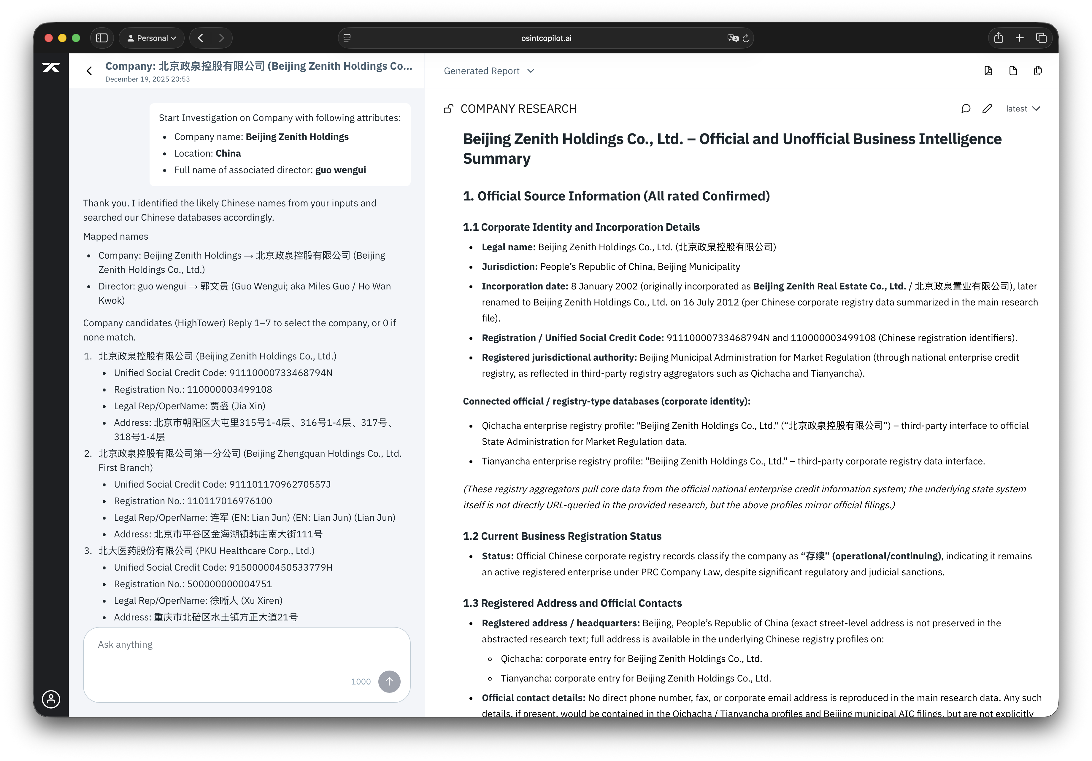Journalistic investigations often take days or even weeks to gather data from multiple sources, translate it, and manually check its accuracy. Accessing hard-to-reach information makes the process even slower. Tesari completes this work in minutes by compiling, translating, and cross-referencing data from global registries, leaks, media, and court filings. It supports many languages, applies smart transliteration, and keeps every data point traceable to its source.